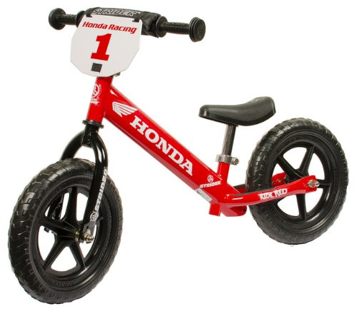 Strider ST-3 Honda No-Pedal Balance Bike If your child can walk, the Honda Licensed STRIDER will get your child cruising through the neighborhood and riding over dirt and grass with ease. The bike is mechanically the same as a standard STRIDER, but is customized with the official Honda graphics and the Ride Red logo along with a Honda 1 number plate When it comes to toddlers, weight and fit are critical Because the STRIDER weighs less than 7 lbs it is easy to control, and quick releases on the handlebars and seat make it a snap to adjust for a growing child. NEW Ultralight One-Piece Molded Wheel. Strong, light, one piece design with proven no-flat EVA Polymer tire